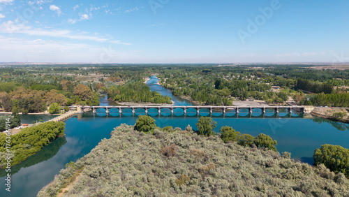 Aerial view of the Ing Ballester Dam on the Neuquén River. It borders the provinces of Neuquén and Río Negro.