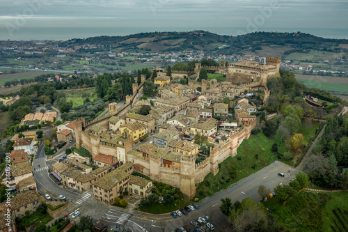 Aerial view of the walled town and castle of Gradara in Marche Italy popular tourist destination of the well preserved double walls and castle