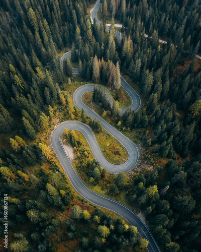Aerial view of the winding road cuts through a dense forest, a ribbon of asphalt contrasting with the deep green canopy, Cortina d'Ampezzo, Veneto, Italy.