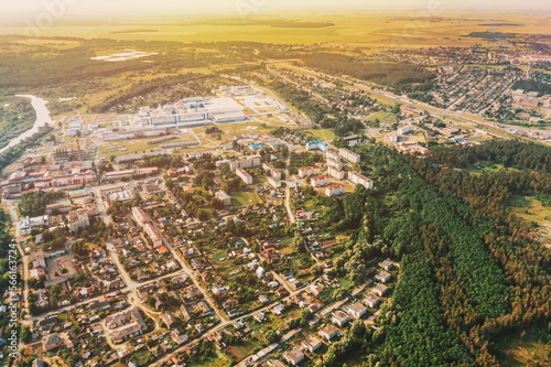 Aerial View Of Town Village Cityscape Skyline In Summer Sunny Morning. Daytime. Residential Houses. Small European City. Residential Areas And Industrial Area