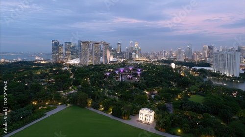 Aerial View of Urban Landscape at Dusk with Lush Green Parks and Modern Architecture in Singapore Skyline with Colorful Lights