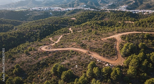 Aerial View of Winding Dirt Road Through Green Forested Hills Near Mountain Range