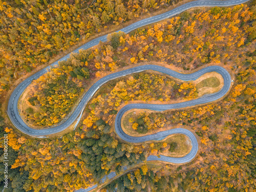 Aerial view of winding road through beautiful autumn foliage with vibrant colors, La Tour Argentiere Les Praz, Chamonix-Mont-Blanc, France.