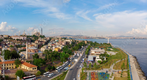 Aerial view on Sultanahmet district with the Blue Mosque and Hagia Sophia in Istanbul