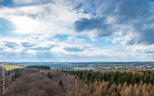 Aerial view over forests and meadows of Westerwald, Altenkirchen, Germany