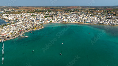 Aerial view Porto Cesareo, a small city on the Mediterranean Sea in the province of Lecce in Puglia, Italy. It is a tourist town located on the Ionian coast of the Salento peninsula.