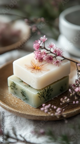 Aesthetic display of handcrafted soap bars adorned with delicate flowers, perfect for promoting relaxation and nature-inspired living.