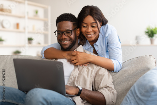 African american couple sitting on sofa, using laptop