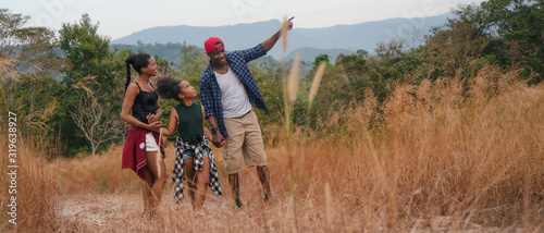 african american family having fun traveling and camping together in natural forest and park