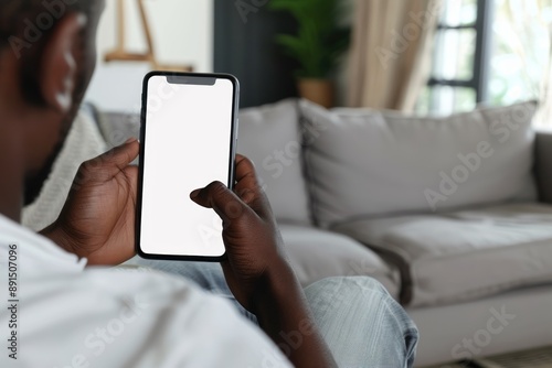 African american man holding smart phone with mockup white blank display, empty screen for app