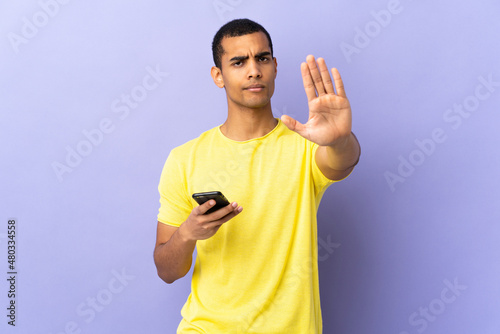 African American man over isolated purple background using mobile phone making stop gesture with her hand