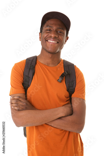 african american man smiling with hat and backpack against isolated white background