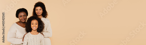african american mother and grandmother standing with smiling granddaughter isolated on beige, banner