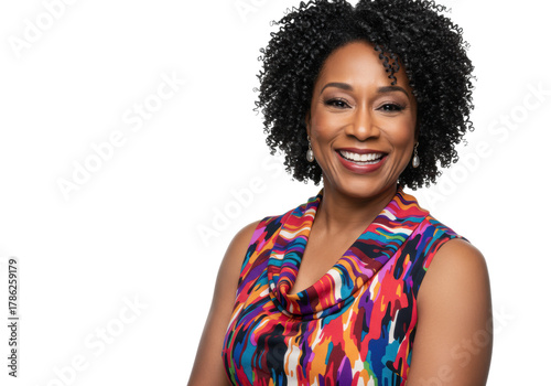 African american woman, mid-40s, short curly hair, vibrant cowl neck top, smiling confidently in high-key studio with white background and copy space. Concept of joy and self-assurance