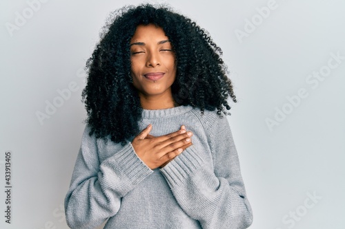 African american woman with afro hair wearing casual winter sweater smiling with hands on chest, eyes closed with grateful gesture on face. health concept.