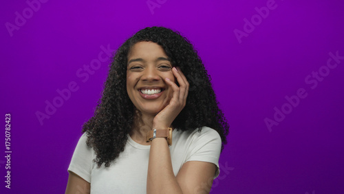 African american woman with hand on cheek laughing in purple studio wearing white t shirt; happiness joy delight amusement.