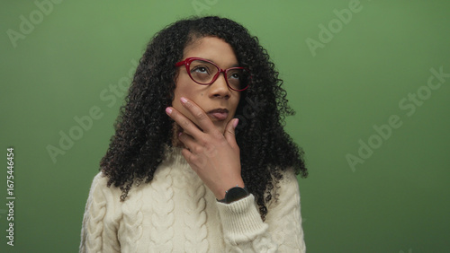 African american woman with red glasses touches chin in green studio; thoughtful introspection curiosity.