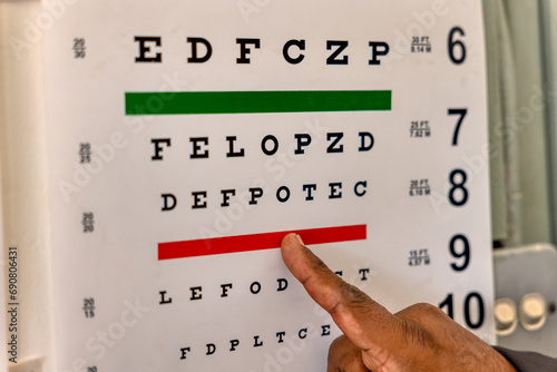 african doctor pointing his finger at an eye chart, testing people vision