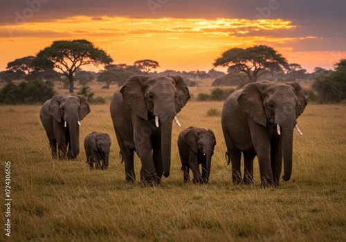 African Elephants Walking on Savannah Grass at Sunset – Wildlife Safari Scene