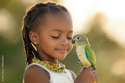 African Girl Smiling Gently at Green Parrot. Vibrant Colors of Bird and Natural Light Create Harmonious Scene. Close Bond Between Child and Nature. Perfect for Wildlife Themes. AI generated