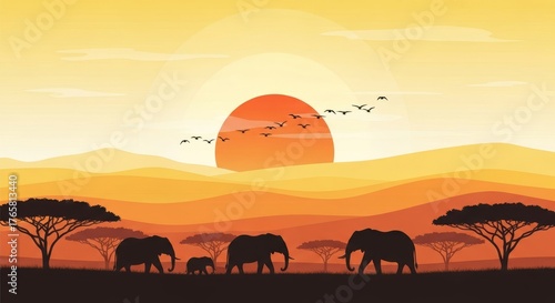 African Savanna Landscape with Elephants at Sunset