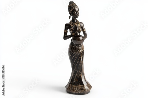 African Sculpture of Woman Holding Vessel. Isolated Statue of Religious Figure in White Background