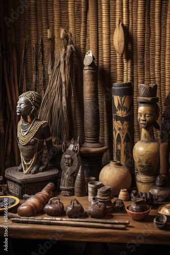 african tribal artifacts displayed on a wooden table, created with generative ai