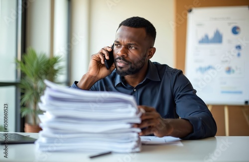 African-American businessman talking cell phone looking at stack documents. Man sitting at desk in office. Serious expression, worried about debt. Finance, paperwork, tax issues. Financial problems,