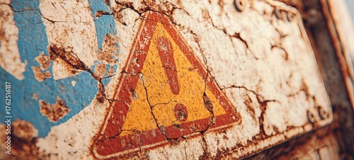 Aged caution symbol with cracked paint and rust