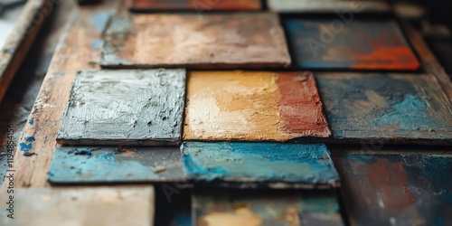 Aged color palette with textured paint blobs in muted browns, blues, and yellows arranged in a grid on a wooden surface.