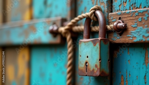 Aged teal metal lock secures rustic wooden surface. Antique lock on weathered door. Vintage hardware on worn wooden surface. Design element, security detail. Aged look, feel. Possible home decor