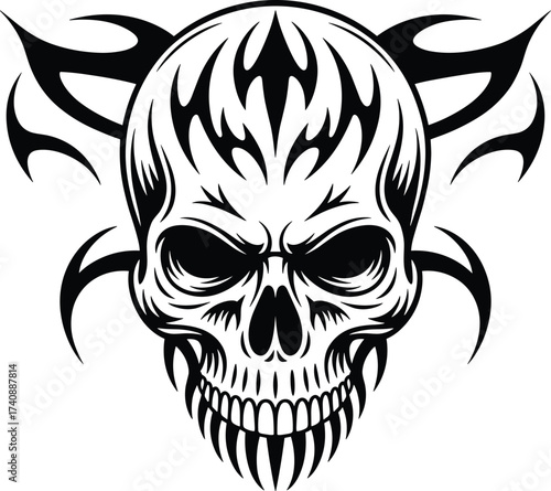 Aggressive Black and White Skull with Tribal Tattoos or Flames, Fierce Expression, Vector Artwork for T-shirt Design, Representing Power, Danger, and Gothic Style.
