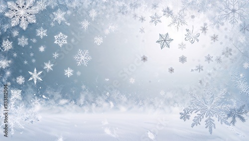 多様な形状の雪片が白い背景に広がるクリスマス感あふれるデザイン。生成AI