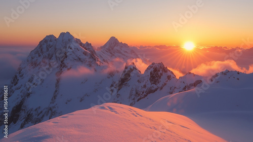 雪景色の険しい山頂と眼下に広がる美しい雲海から登る朝日をリアルに描いたAI生成画像