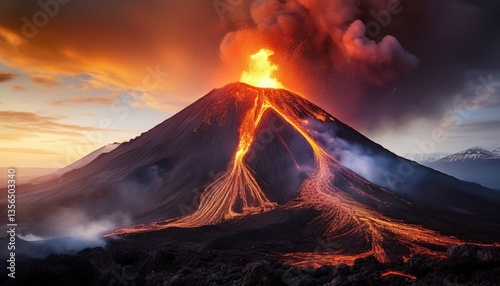 火山が噴火してマグマが流れる様子イラスト。AIで生成