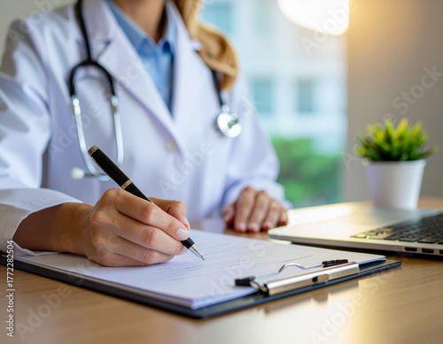 カルテを記入する白衣を着た人物の手元 AI生成素材