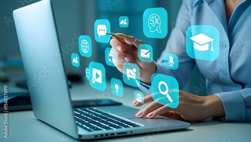 AI Artificial Intelligence technology for education. Modern digital learning, courses for developing new skills and e-learning. Man learning lessons and online seminars on laptop.