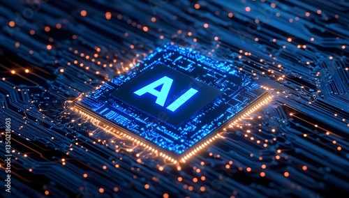AI chip illuminated on a circuit board, representing artificial intelligence and technological advancement in computing