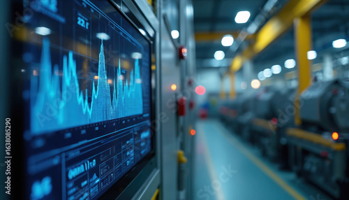 AI energy management system monitors factory operations on digital displays. Smart grid technology optimizes industrial production for enhanced energy efficiency, sustainability. Features advanced
