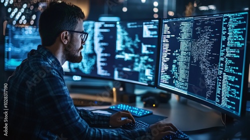 AI Engineer Analyzing Data Visualizations and Code on Monitors