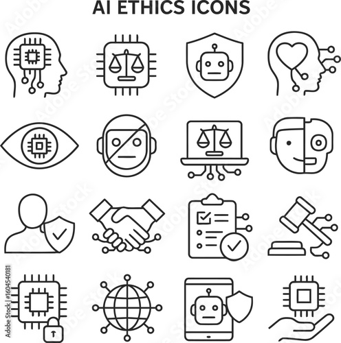 AI Ethics Line Icon Set – Artificial Intelligence and Technology Responsibility Symbols