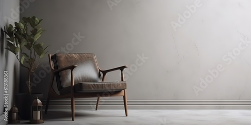 AI Generated. AI Generative. Minimalistic living room design decoration with elegant armchair at wall wirh plant and cozy decor. Graphic Art