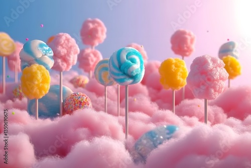 AI generated illustration of colorful lollipops on pink cotton candy landscape. Fantasy sweet candy land with pink, blue, yellow pastel colors. Cute wallpaper, sugary background for holiday
