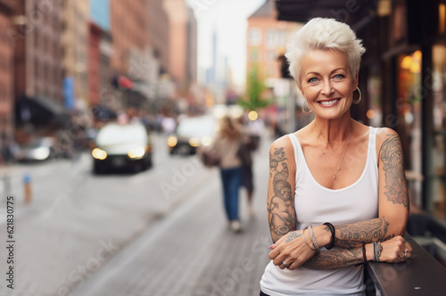 AI generated image of mature woman in the city with tattoos