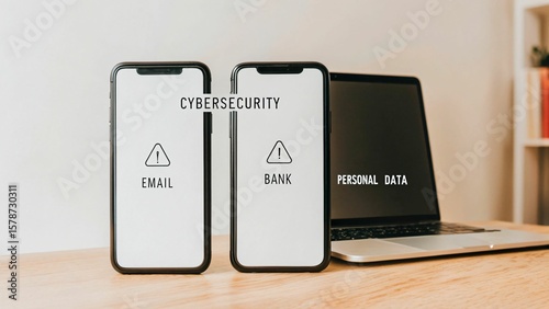 Ai generated image of smartphones display cybersecurity warnings next to a laptop on a desk