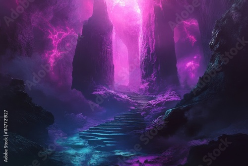 Ai generative, Stone Steps Leading Upwards Through a Cave Lit with Purple Lightning