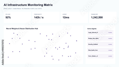 AI Infrastructure Monitoring Matrix Dashboard vector UI template with data points and active agents on white background