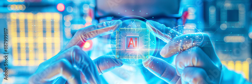 Ai tech, computing with neural engine CPU, Artificial Intelligence for big data analytics, robotic process automation, Man working on neural network microchip, Chat with AI