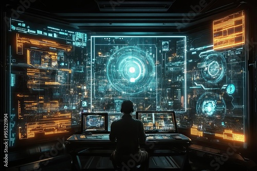 AIcontrolled world, advanced technology, futuristic urban landscape, holographic displays