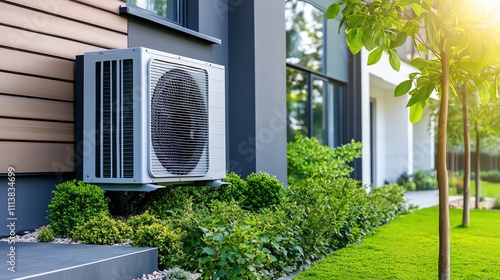 Air source heat pump installed in residential building. Sustainable and clean energy at home